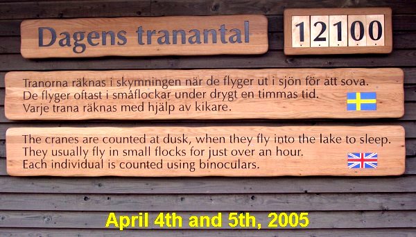 ![]() Viele tausenden .... doch nicht so vielen wie lätzten Jahr, 12.700 ![]() In der Abenddämmerung verlassen die Kraniche innherhalb einer Stunde in Kleingruppen den Futterplatz, um zu ihren Schlafplätzen im See zu fliegen. Mit Ferngläsern und ein wenig Übung lassen sie sich hierbei gut zählen. Wir arbeiten mit diesen Zeiten: - Übersetzung kommt auch Page 2 - Kraniche im Flucht. Page 3 - Kraniche am Erde Page 4 - Anderen Vogeln uzw. Page 5 - Kraniche Entfernung und Landung Page 6 Schwanen am Hornborgasee |