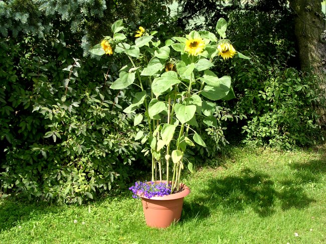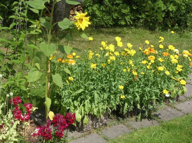 Nede til venstre blomster løvemunn, og solsikken vokser i