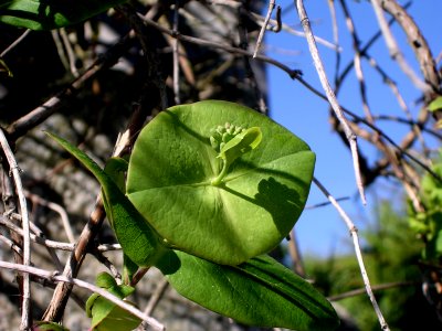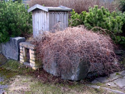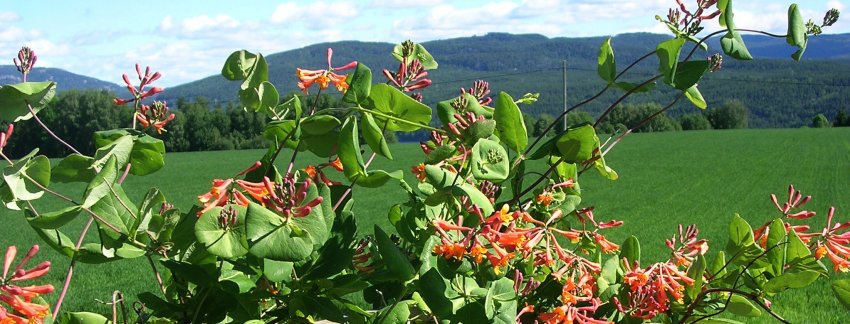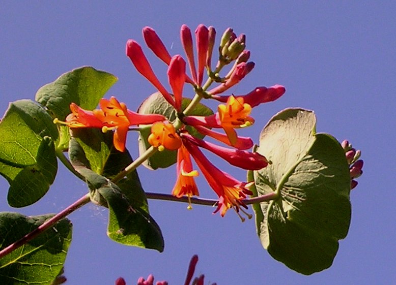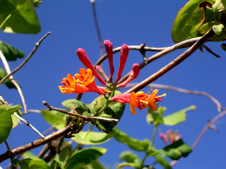 ![]() 27.04.2006 - 15.06.2006. t.h. en masse tørre kvister - t.v. foran røykeovnen, noen tørre kvister med små blad. Hva er det? 15.06.2006. Blomsterknopp midt på bladet! 15.06.2006. Utrolige blomster på en 'død' busk! Er det kaprifol eller vivendel? Kanskje en Lonicera tragophylla? http://www.ubcbotanicalgarden.org/potd/2005/06/lonicera_mandar.php