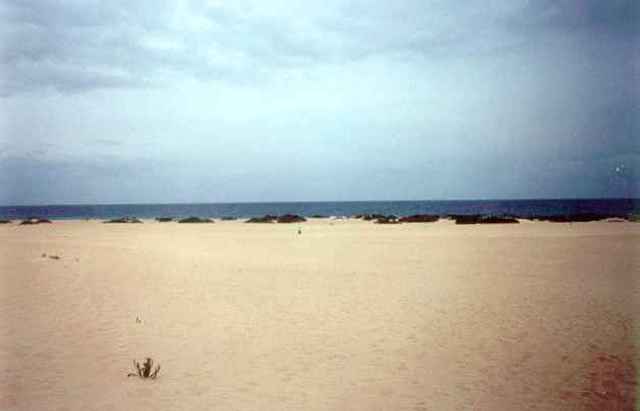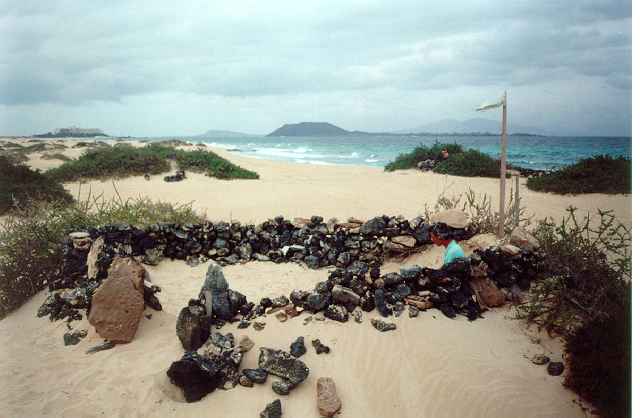 this picture was taken late in the afternoon, on a windy day in december, and most people had gone home. During daytime, thousands of tourists in the nearby Correalejo, are coming out here, by car, bicycle etc. Notice Isla Lobos in background, and further behind also Lanzarote. Not our favourite beach, so we had to do it all over again.... |