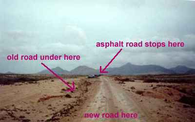 we hit one of those green roads on the map. After a few miles, at the end of the asphalt road, we had to stop the car, and leave it. Further on, we had to walk on a new road, as the old asphalt road was covered with sand and stones from here. Thethe asphalt road had served as a way for the water to run from the mountains and down to the sea. Here it just became too big..... |