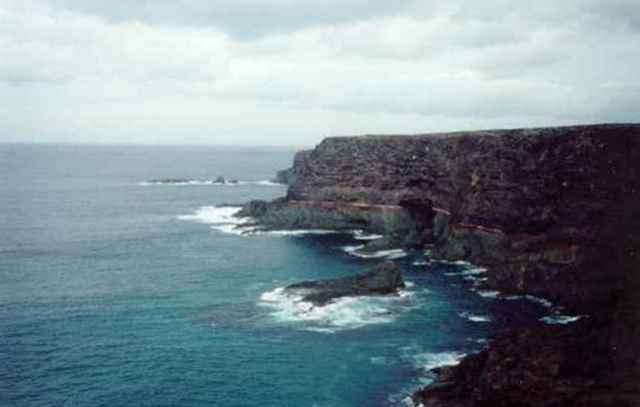 Nice, clear salty water, and lot's of fish too! This is looking north from the end of the beach. Notice the two 'visitors' that came by car - up on the hill. How small they are! And far away, too. An old lime-kiln lies in the background. Now only ruins. Observe that when walking along the coastline, you have to pass the point in the background, and you will have to take a bath following this route when tide is high! - or even worse - to fly... |