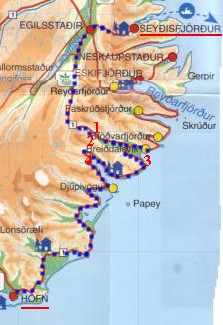 ![]() Of course, not! After leaving Seidisfjörður we went up the hill, and on the top we had a wonderful sight of the Fljótsdalur (Flkjot Valley) with the mountaintop Snäfell at 1,833 m asl in the background, some 70 km away. ![]() Just down to the right on the previous picture, was the town of Egilsstaðir. From there we turned south on the mainroad No. 1, which in time was going to bring us around all of Iceland. ![]() This is going to be exciting! Within the first hour on Iceland - here is WILDLIFE! ![]() Breiðalsheidi, No. 1 on the map, which also shows day 1.. ![]() Picture No 2, probably Kistufell. ![]() From Breiðalsvik and North. No. 3 on the map. ![]() Not normally around back home. No. 4 on the map. Iceland has a lot of mountains, and it would have been nice to have picture of all of them, but capacity in my camera is limited, and so is my web-space.