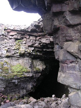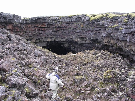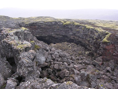 ![]() The next morning we visited the Viðgerhellir cave, one of the three largest in Iceland. As it rained, and we were alone, noone could threat us going further down, so we didn't.... ![]() Of course, we did look into some of the holes, but we don't think we found the main entrance. So that's why we're still here, able to tell you the story. ![]() Some places the lava-roof had fallen down and revealed big holes. Here we got a picture of what had formed the Hraunfossar, where the water came right out through the mountainslopes.
