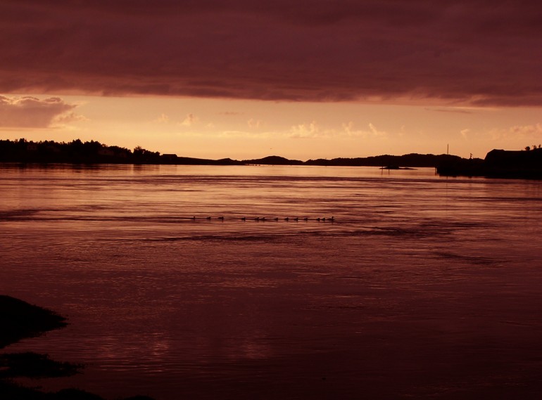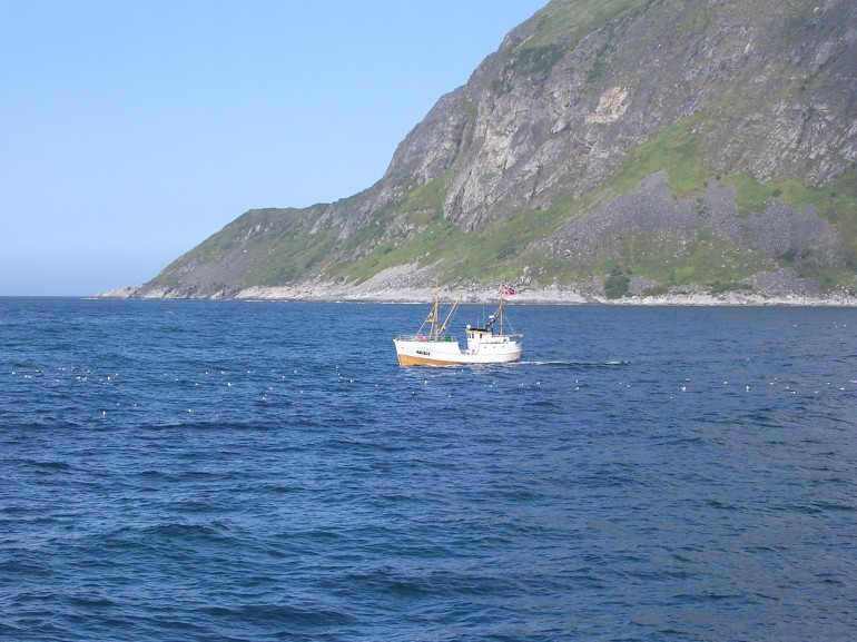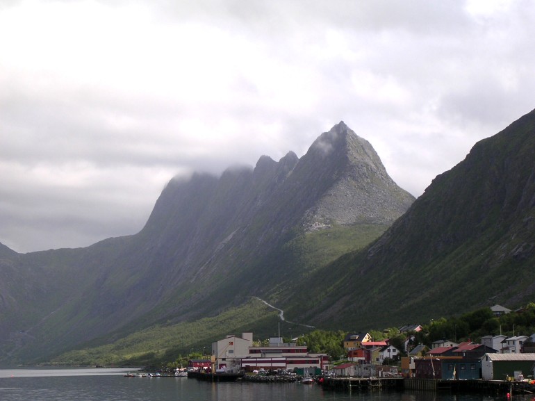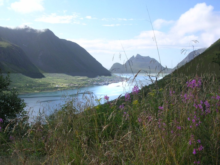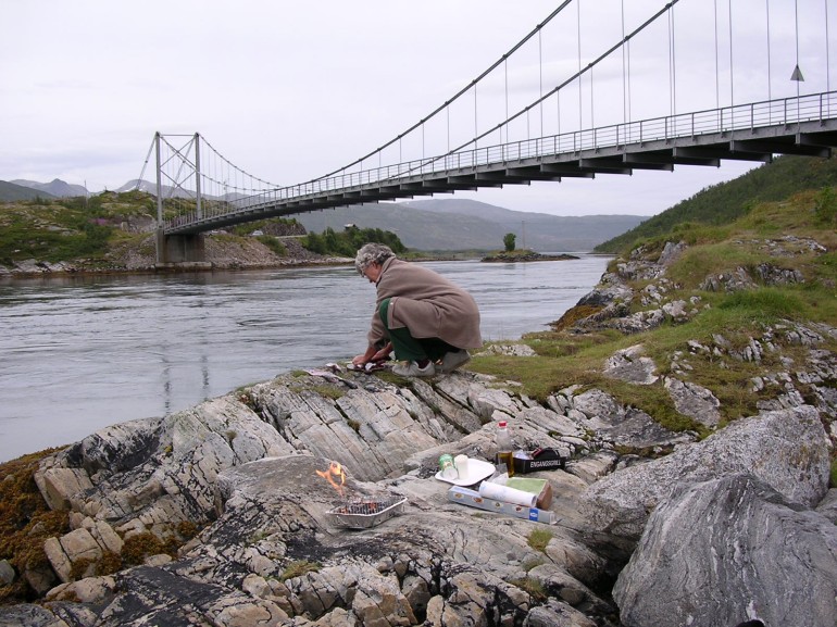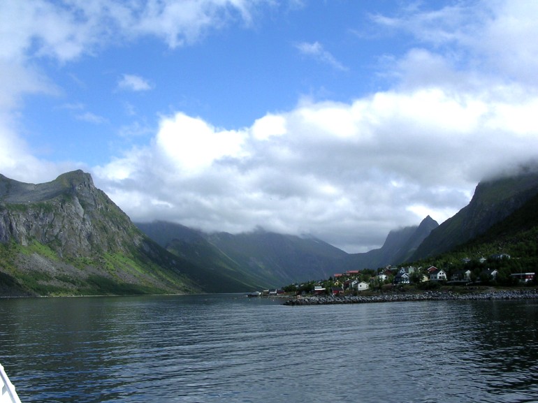 Tenk på dette en varm og rolig sommerdag! Dag 11 ![]() I kø for å ta fergen fra Andenes (i bakgrunnen) og over til Senja. ![]() I det vi forlater Andenes sprekker skydekket opp bak oss. Kanskje solen titter fram snart? ![]() Vi nevnte tidligere at landet mellom fjell og hav her var veldig flatt, ikke sant? Hvis du ikke tror oss, spør hvem som helst som bor i Andenes! ![]() En halv time senere, og Senja dukker opp i skyene, men fremdeles ser det ut til at det regner der borte...... ![]() Etterhvert som vi kommer nærmere, endrer været seg hurtig, og den første delen av Senja ligger i solen igjen. En heldig fiskerer på sin vei ut mot havet, og måkene følger trofast med. ![]() Vårt bestemmelsessted på Senja, Gryllefjord, et lite tettstad på Senjas bratte kyst. Skyene henger fremdeles tungt over det indre av øya. ![]() La du merke til fjelltoppene ovenfor tettstedet på det forrige bildet? ![]() Få minutter senere har vi rundet fjorden og beveger oss oppover på den andre siden mot et mindre fjellpass. Det er riktignok bare 170 m o h, men det gir oss en praktfull utsikt ut over Gryllefjord og halvøya utenfor. ![]() Alt klart for grilling. Hva fikk oss til å sette i gang med dette? Optimisme. Og en times fiske i en annen malstrøm, dog ikke så sterk som Saltstraumen. ![]() Ikke dårlig etter en time uten napp, bortsett fra en annen familie som bare fisket for moro skyld, så på en måte kan man jo si at 'vi fikk fisk'..... Uansett så smakte det glimrende, og vi gledet oss over et sent aftensmåltid. (Om de noen gang ser dette, dem som tok fisken, så takk enda en gang.....). ![]() og det bringer oss til slutten av enda en fin dag |