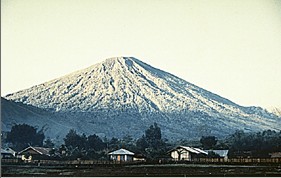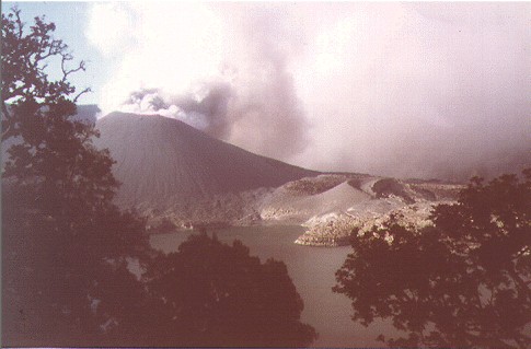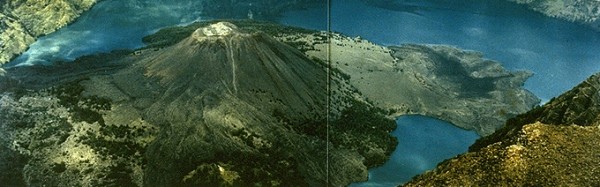 ![]() Fotografi av Barujari kronen (venstre) og Rombongan kronen (høyre) den 21. november, 1994, med Segara Anak sjøen i forgrunnen. Bildet er tatt SV-over fra den NØ-kaldera-kanten. Courtesy of P.M.Vincent. ![]()