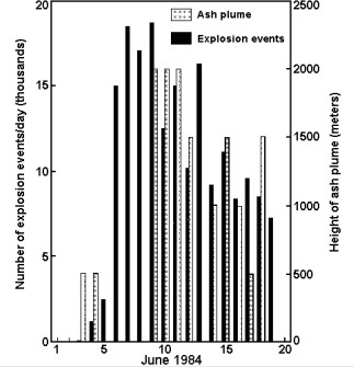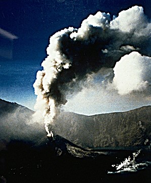 En askefyllt utbrudds-skysøyle reiser seg den 30. juni, 1994 over toppen på Barujari, en pyroklastisk krone på bunnen av Rinjani's Segara Anak kaldera. Damp stiger opp nederst til høyre fra en lavaflom som begynte under et tidlig stadium etter utbruddet den 3. juni. Photo courtesy of Volcanological Survey of Indonesia, 1994