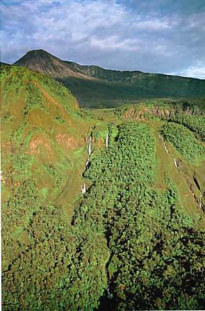 by a young, unvegetated stratovolcano that rises about 1300 m above