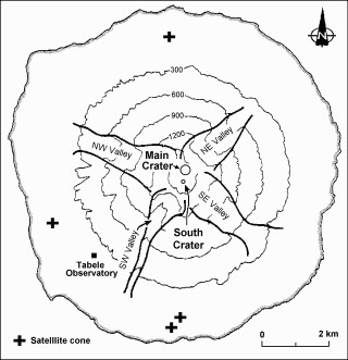 sydlige krater. Fint aske fra utbruddet drev nordover, og falt