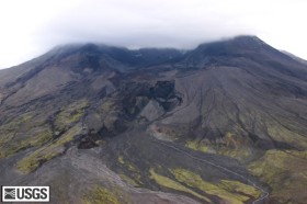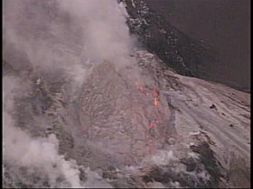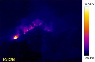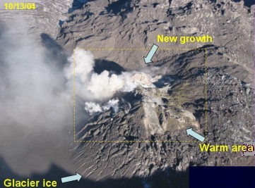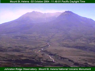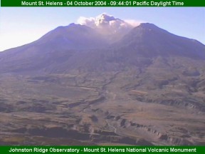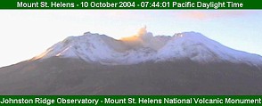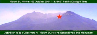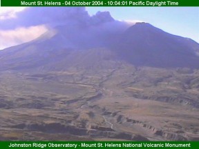 Under current conditions, small lahars (volcanic debris flows) could be triggered if hot material from the new lava extrusion swiftly melts glacier ice. Such lahars pose negligible hazard below the Sediment Retention Structure (SRS), but could pose a hazard to people working or recreating along the river channel upstream of the SRS. Furthermore, due to weather and stream-flow conditions at this time of year, it is not unusual for rivers draining the volcano to contain high concentrations of sediment that turn the water murky. There will no longer be daily media briefings at the Headquarters of the Gifford Pinchot National Forest. (From USGS) More lava emerged Thursday on the crater floor of Mount St. Helens, expanding a rock formation building on the volcano's old lava dome. Airborne observers have seen "vigorous jets" of ash and steam near the new growth. Aerial photographs suggest some uplift on one side of the emerging rock "fin." Thursday, October 14th, 2004, 18.00 PDT (Wednesday), 01.00 UTC Thursday