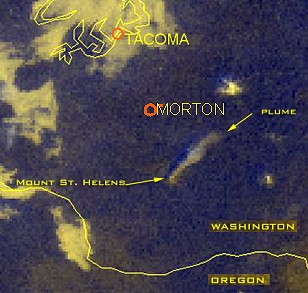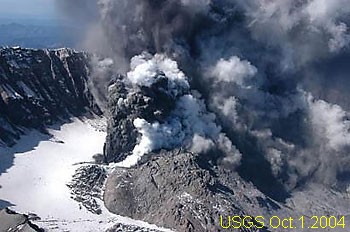 shortly after 9:00 a.m. PDT, (16:00 UTC) the most vigorous steam and ash emission of the current period of unrest began. See picture below "another one?". The emission originated from the same vent as have others this past week, as well as from another nearby new vent in the intensely deforming area on the south side of the 1980-86 lava dome. For more than one hour, steam clouds billowed from the crater. The ash content varied with intensity of steam jetting from the vent. For the first time, ash content was sufficient that it was detected by National Weather Service Doppler Radar. Steam and ash clouds reached about 12,000 feet and drifted north-northeastward. Ash forecasts warned downwind residents. Media reports indicate that a light dusting of ash fell in Morton, (see sattelite picture above) Randle, and Packwood, Washington, towns about 30 miles from the volcano. Nearby traffic on U.S. 12 stirred up the ash, slightly reducing visibility. We have no reports of ash falling at greater distances. The rate of seismicity dropped during and the emission and has stayed at relatively low rates. We infer that magma is at a very shallow level and could soon be extruded from a vent in the deforming area. Additional steam and ash emissions are likely and could occur at any time without warning. Conditions suggest that there is also an increased probability of larger- magnitude and more ash-rich eruptions in coming days. From USGS Tuesday, October 5th, 2004
