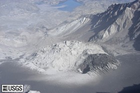 Mount St. Helens uplift with new growth and new avalanche fan, as seen from high angle on the north. USGS Photograph taken on 14 October 2004, by Jim Vallance. The stone fin'' on the new lava lobe inside the crater at Mount St. Helens seems to be starting to split, scientists reported Friday. The fin, which is about 200 feet tall and 300 feet wide, is building on the new lava dome, which is about 1,600 feet in diameter and 400 feet high, Friday, October 15th, 2004, 18.15 PDT (Thursday), 01:15 UTC Friday The area of both the uplift and the new lobe of lava have increased slightly since yesterday. Yesterdays gas-sensing flight detected low levels of sulfur dioxide and hydrogen sulfide, but no carbon dioxide. Abundant steam continues to rise from the area of lava extrusion to the crater rim