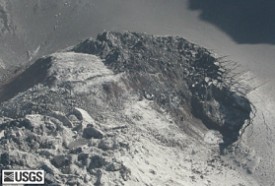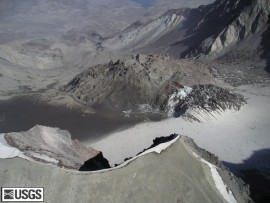 Left: Mount St. Helens dome and uplift from the east. Right: From the west. USGS Photographs taken on 11 October 2004, by Kirstie Simpson and Jon Major Seismic activity remained at a low, but gradually increasing level yesterday. Tuesday mornings visual observations and thermal imaging of the 1980-86 lava dome, the intensely deforming and uplifting area on the south side of the dome, and the new lava extrusion first seen yesterday afternoon were hampered by steam clouds. Conditions appeared similar to those of yesterday afternoon, with high temperatures (up to 600 degrees C) around the fin-shaped lava extrusion in the western part of the uplift. The area of high temperature appears to have increased in size. Abundant steam continued to rise from the fin area to the crater rim, from which it was dispersed southeastward by strong winds. As a result of the intense unrest of the past two and one-half weeks and recent observations, we infer that magma is at a very shallow level and is likely extruding onto the surface. As last night (Tuesday), incandescence from hot rock or gases could reflect off steam clouds and be visible from north of the volcano. During times of unrest, Mount St. Helens and similar volcanoes elsewhere typically go through episodic changes in level of unrest over periods of days to weeks, or even months. Such changes are in part driven by variations in the rate of magma movement. (From USGS) (Looks very much alike what is going on at Etna at present.) Tuesday, October 12th, 2004 ![]() Left: St. Helens dome and uplift as seen from the northwest. Right: Crater and dome from northeast USGS Photographs taken on 10 October 2004, by Jim Vallance Tuesday morning: (midnight in Washington): No change in activity. Smoke coming up, and quakes every 5 to 10 minutes. According to USGS survey Monday, new thermal images reveal that parts of the lava dome in Mt. St. Helens' crater are getting hotter and scientists said that an area on the south side of the dome appeared perforated, as if magma has been hammering at the surface. "What's happened in the last day is the magma is not just pushing up but pushing out. We no longer have just isolated vents. Instead, the whole area is pushing up, the gas is the fuse, just oozing out," a U.S. Geological Survey geologist, said. He said scientists believed the magma, or molten rock, was less than half a mile below the surface. The glacier, which is a newcomer in USA, began to grow after the 1980-eruption. It is now 3,500 feet wide between the south side of the lava dome and the crater wall. Some parts are 600 feet deep, although the average is 325. Scientists are calculating now how much water that translates to. Anyway, it would have to break up an enormous amount of material, if St.Helens wishes to. Only one other volcano -- in Katmai, Alaska -- has hosted glaciers that have grown as quickly as this one. Recent activity at Mount St. Helens is lifting part of the glacier.Some layers are nearly vertical right now at a site on the southeast side of the dome where underground pressures are lifting ice and stone almost as high as the 1,000-foot-tall lava mound. The still-unnamed glacier contains about 120 million cubic meters of snow, ice and rock. Monday, October 11th, 2004 As the sun started to rise Monday in western Washington, a small cloud could be seen rising slowly up from the crater. The volcano vented steam for several hours Sunday. Scientists believe it happened after part of the south side of the lava dome in the crater broke off, taking some of a glacier with it.Seismic activity at the mountain remains relatively low. USGS 07:45 PDT 14:45 UTC Seismicity overnight remained at a low level similar to October 10. Small earthquakes (about magnitude 1) have continued at a rate of about 1 per 5 to 10 minutes. Viewing conditions were very clear most of October 10, and fresh snow had fallen to the level of the crater floor north of the dome. A USGS field crew noticed a thin ash deposit on the snow in the crater and just beyond the crater rim, trending southeast from the active area. A steam plume rose to crater rim level or slightly above all day on