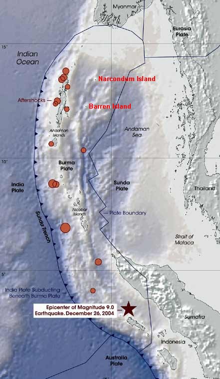Narcondum vulkanen ligger på en øy i Andaman-sjøen, nærmere bestemt på 13°43'Nord 94°25'Øst, og er en del av en vulkansk kjede som går nordover fra Sumatra til Myanmar (tidligere Burma). Den lille 3 x 4 km brede øya ligger omkring 130 km øst for den nordligste av Andaman-øyene, og når opp i 710 moh, men foten av øya ligger omtrent 1.000 m under havoverflaten. Øya er sparsomt bevokst, omkranset av klipper på sydsiden. Det er ingen bevis for utbrudd i historisk tid, selv om området rundt toppen er mindre bevokst enn resten av øya. Navnet betyr "Helvetes avgrunn", selv om navnet riktignok kan ha blitt brukt her istedet for på naboøya med den historiske aktive Barren-øya vulkanen, 140 km lenger SSV. Se kart her. Mandag, 3. januar 2004 The Darwin VAAC har bekreftet(?) at Narcondum.vulkanen i det Indiske Hav har begynt et utbrudd. Utbruddet kom etter det nylig store jordskjelvet og etterskjelvene i området. Vulkanen har tidligere vært oppført som sovende. Narcondum er den andre vulkanen som har hatt utbrudd i området etter det store jordskjelvet for en uke siden.
