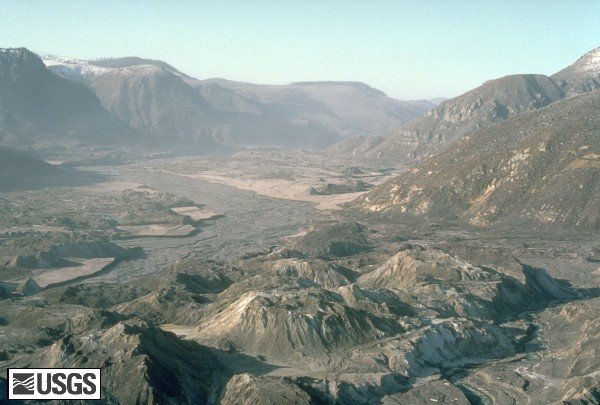 Downstream view of the North Fork Toutle River valley, north and west of St. Helens, shows part of the nearly 2/3 cubic miles (2.3 cubic kilometers) of debris avalanche that slid from the volcano on May 18, 1980. The avalanche traveled approximately 15 miles (24 kilometers) downstream at a velocity exceeding 150 miles per hour (240 km/hr). It left behind a hummocky deposit with an average thickness of 150 feet (45 meters) and a maximum thicknes of 600 feet (180 meters). USGS Photograph taken on November 30, 1983, by Lyn Topinka. |