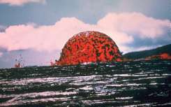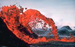 ![]() Foto: J.D. Griggs, 25. februar 1983 Bueformet lava-fontene 10-15 m høy, på den østlige sprekk-sonen av Kilauea Vulkanen, Hawai`i. |